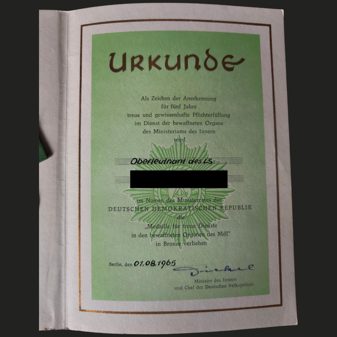 Die Medaille wurde an einen Oberleutnant des LS (Luftschutzes) am 01.08.1965 verliehen und unterschrieben vom damaligen Minister des Innern und Chef der Deutschen Volkspolizei Friedrich Dickel.