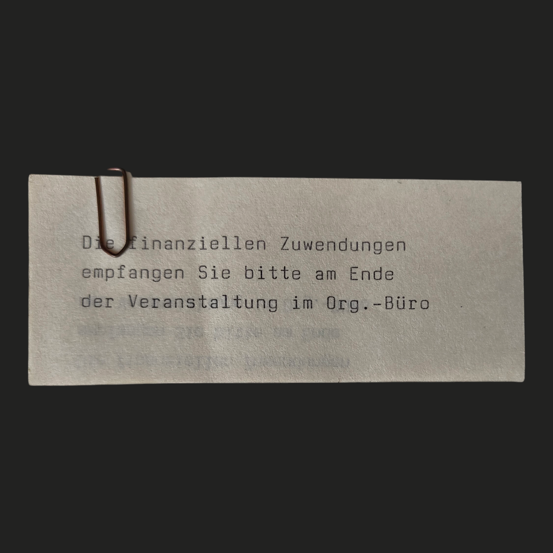 "Die finanziellen Zuwendungen empfangen Sie bitte am Ende der Veranstaltung im Org.-Büro"