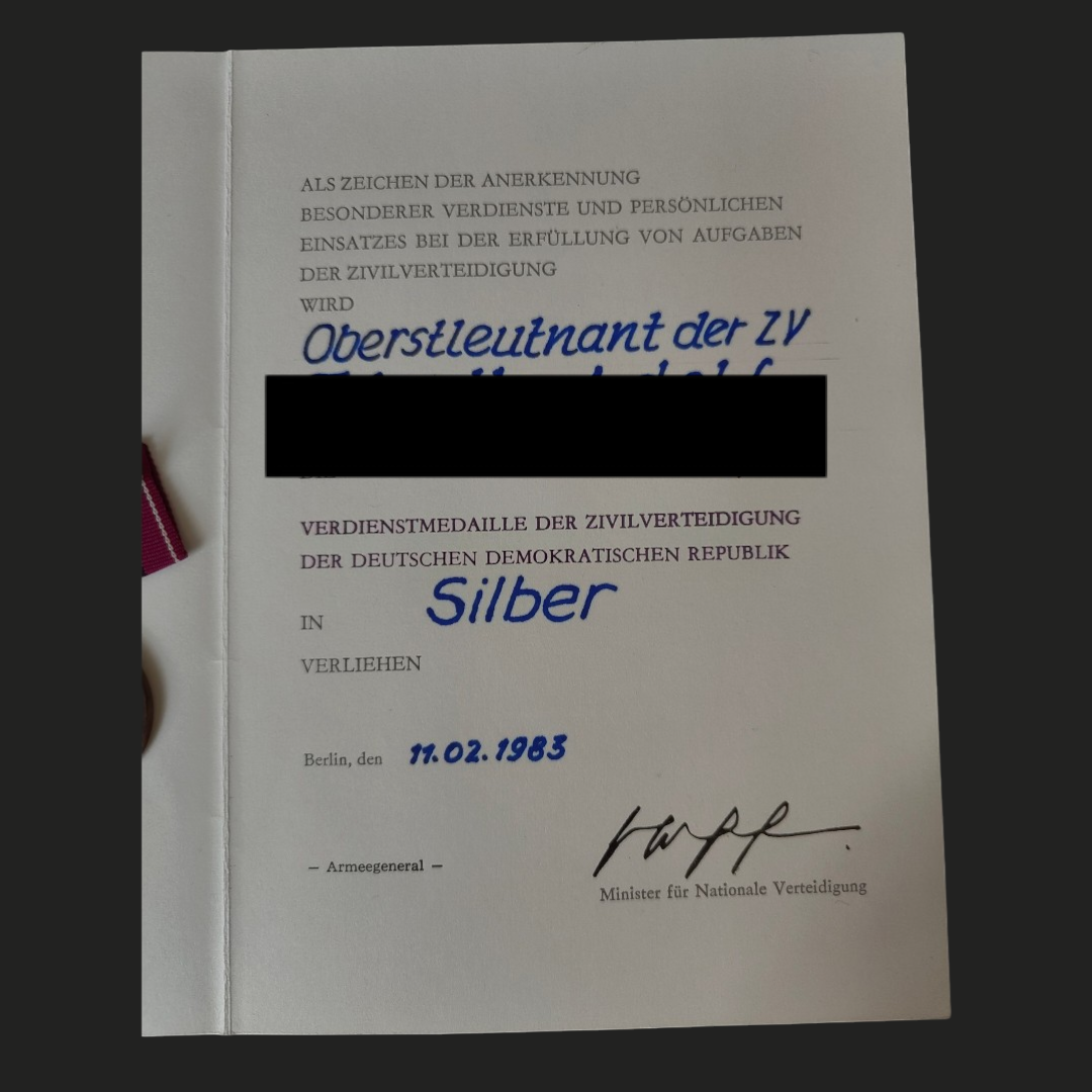 Zu sehen ist eine Verdienstmedaille der Zivilverteidigung in Silber samt Urkunde. Es handelt sich hierbei um die Version des MdI (die Links Schlaufe des Bandes ist über der rechten Schlaufe).